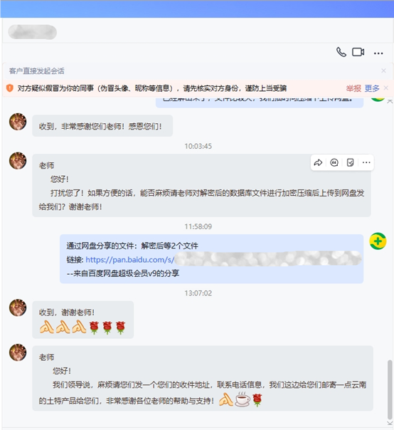 该公司的相关技术人员在了解到我们有该勒索软件的技术解密方案后,也怀着试试看的心态联系到了我们。而我们的技术人员不负所托,仅用了不到2小时的时间,便恢复了其所有重要数据。感激之余,用户坚持要给我们寄送云南特产表示感谢。面对这份特别的心意,我们深感技术工作的价值不仅在于解决技术问题,更在于守护人们的数字生活。