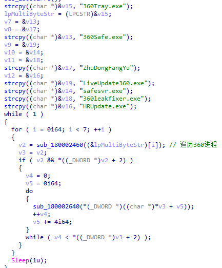 木马启动后会循环检测360Tray.exe、360Safe.exe、ZhuDongFangYu等360其他相关程序以及火绒的HRUpdate.exe如果检测到这些程序木马会尝试通过驱动终止相关安全软件程序。